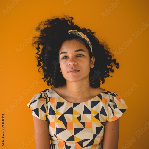Portrait of a confident woman with coiled hair in geometric dress against vibrant orange background expressing individuality and strength.