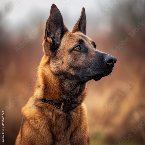 Portrait of a Belgian Malinois dog in a natural setting, showcasing its alert expression and striking features with a blurred background to emphasize focus on the dog's profile.