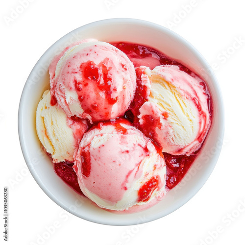 Isolated top view of cherry vanilla ice cream with cherry sauce in white bowl on white background