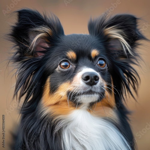 Close-up portrait of a Papillon dog with fluffy ears and expressive eyes in natural lighting