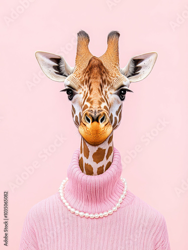 Stylish giraffe portrait in haute couture showing humor and elegance