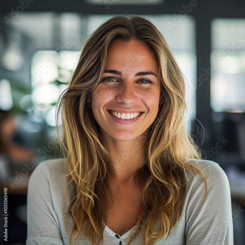 Close-up of smiling Norwegian businesswoman in modern office setting
