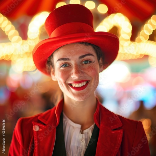 Portrait of a smiling female ringmaster at the circus with festive lights in the background