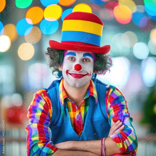 Colorful female clown portrait with joyful vibes and bokeh lights