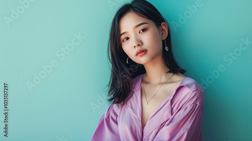 Elegant Vietnamese teenager posing in a stylish purple dress