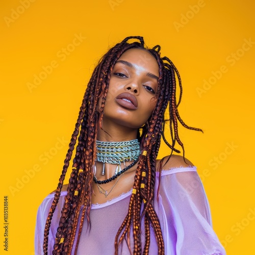 Portrait of a radiant person with long auburn braids interwoven with beads wearing a lilac top against a vibrant orange background