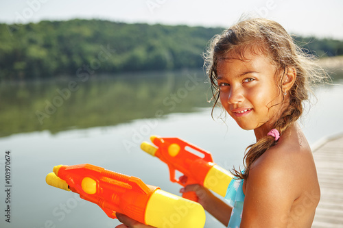 Mädchen am See spielt mit Wasserpistole