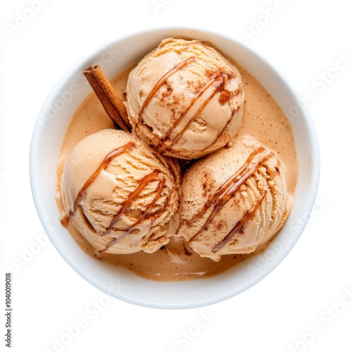 Isolated top view of pumpkin spice ice cream with cinnamon stick in a bowl – a delicious autumn dessert