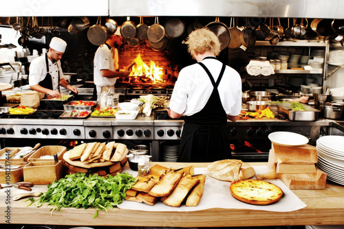 Group of chefs collaborating in a busy restaurant kitchen preparing dishes with teamwork and creativity