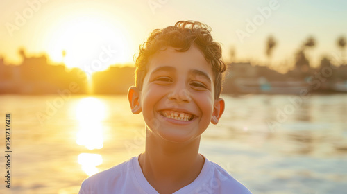 Joyful Egyptian boy smiling at sunset by the river, radiating happiness and youth