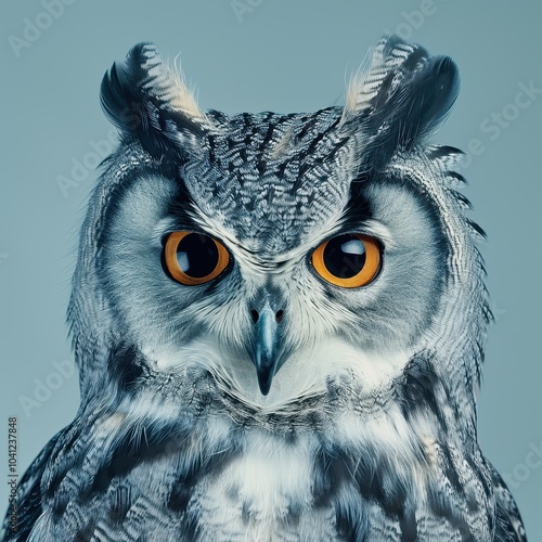Captivating portrait of a majestic owl with striking orange eyes in a professional studio setting, showcasing intricate feather details and a calm, wise demeanor.