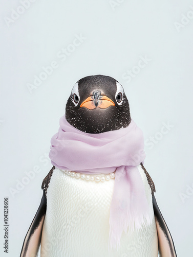 Portrait of a penguin in elegant designer attire featuring a chic bow tie, blending humor and style in a unique animal fashion concept, set against a minimalist backdrop.