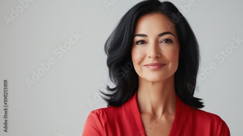 A joyful Middle Eastern woman in her 40s smiling confidently in a vibrant red blouse against a light background