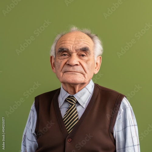 Portrait of a tenacious senior man in his late 60s with a receding hairline, wearing a striped shirt and tie in front of a green background