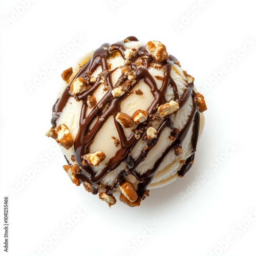 Isolated top view of creamy vanilla ice cream scoop drizzled with rich chocolate syrup on white background
