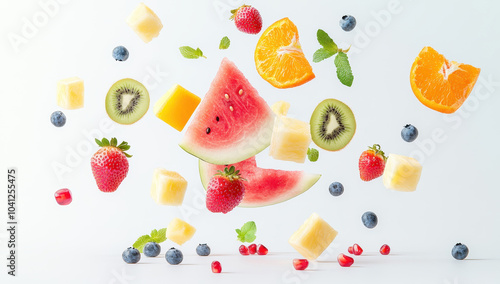 Vibrant fruit arrangement with oranges, kiwis, bananas, and strawberries