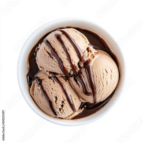 Isolated top view of creamy coffee ice cream with rich mocha sauce in a white bowl, capturing a delicious indulgence in dessert imagery