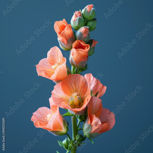 Studio shot of vibrant orange Nasturtium flower with detailed petals and lush green leaves on a warm orange background