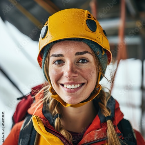 Portrait of a female mountaineer in helmet and gear ready for an expedition