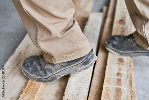 Young male construction worker wearing safety workwear installing door at incomplete house