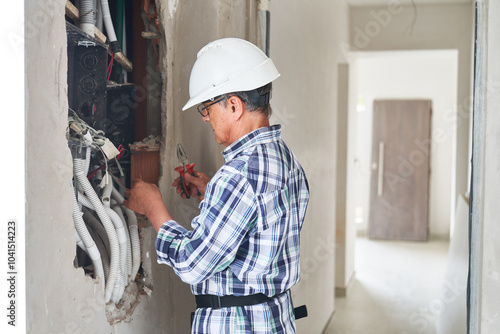 Side view portrait of senior male electrician fixing wires in wall with pliers at incomplete house construction site