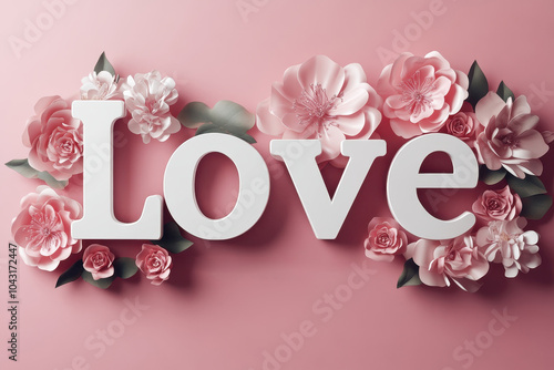 3D typography of love with pink and white floral theme background