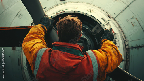 Worker maintaining offshore wind turbine engine in protective gear