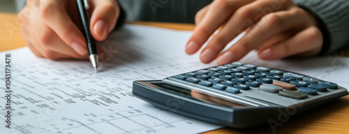 Close-up of a businesswoman's hand using a calculator to manage finances, highlighting focus and accuracy within a professional setting.