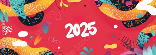 Colorful illustration of a serpent for the 2025 Year of the Snake Chinese New Year celebration featuring vibrant clouds in a traditional art style
