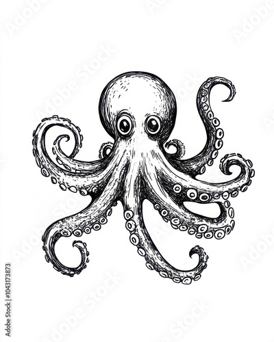 Minimalistic black and white stick figure drawing of a cute octopus with intricate details and expressive eyes