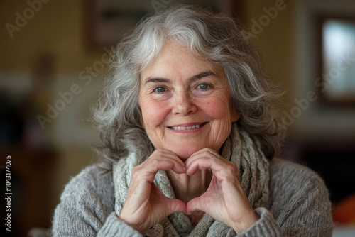 Close-up of a smiling senior woman creating a heart shape with her hands, expressing love and happiness in a bright and cheerful setting.