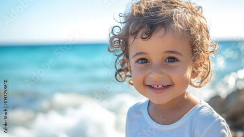 Joyful Libyan toddler enjoying nature by the sea, curly hair glistening in sunlight