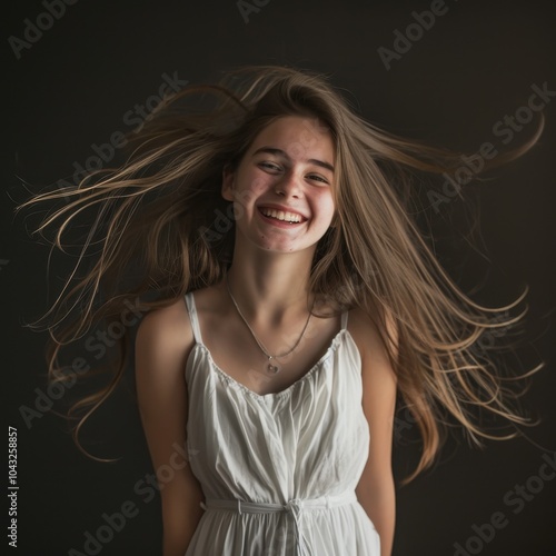 Excited teenage girl with long hair smiling joyfully in a white dress on a dark background, capturing youthful energy and happiness.