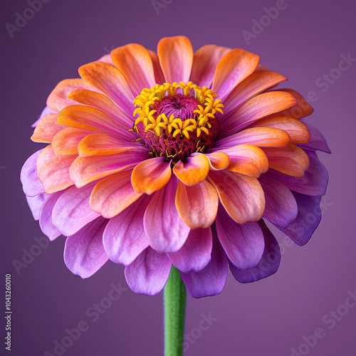 Professional studio shot of a vibrant Zinnia flower showcasing vivid orange and pink petals against a soft blurred background