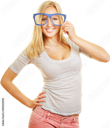 Lachende Frau mit Nerd-Brille vor Gesicht