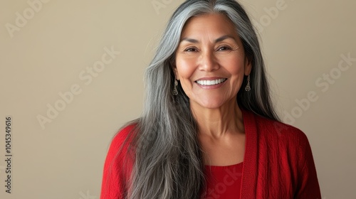 Portrait of a smiling senior woman with long gray hair wearing a red sweater, exuding happiness and warmth