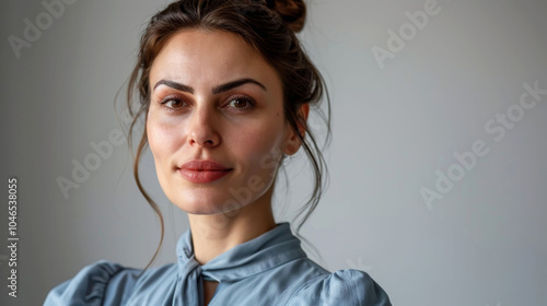 Confident businesswoman in her 30s with a stylish bob haircut standing in a modern office