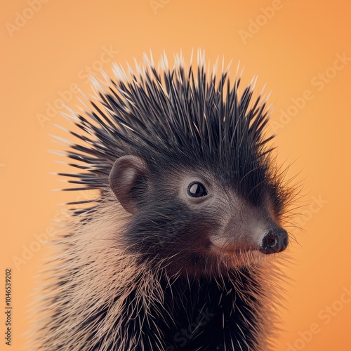 Studio portrait of a porcupine against a warm orange background showcasing its unique spines and inquisitive expression
