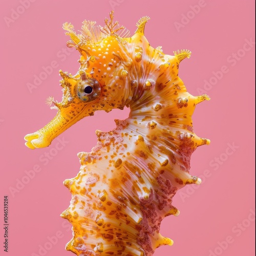 Close-up portrait of a vibrant yellow seahorse, Hippocampus, against a pink background in a studio setting showcasing intricate details and textures of this unique marine animal.