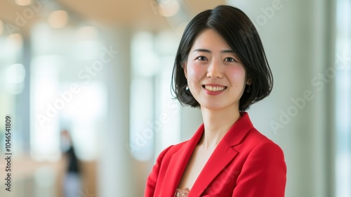 Confident Chinese businesswoman smiling professionally in corporate environment