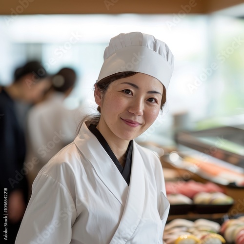 Professional female sushi chef in traditional uniform posing in restaurant kitchen