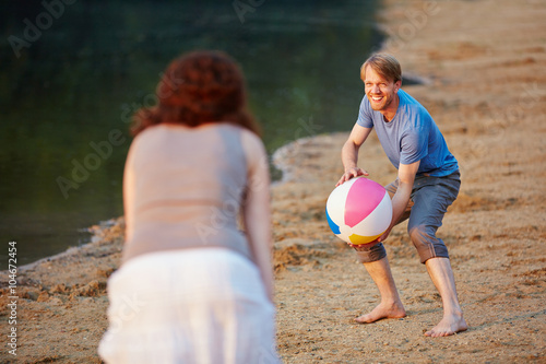 Paar spielt Volleyball mit Wasserball im Urlaub