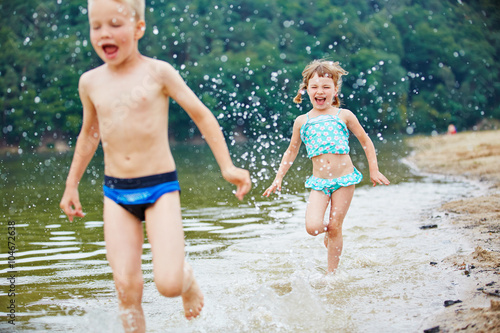 Lachende Kinder rennen im Wasser