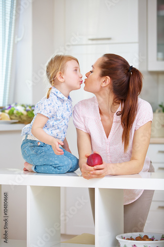 Mutter und Tochter küssen sich in der Küche