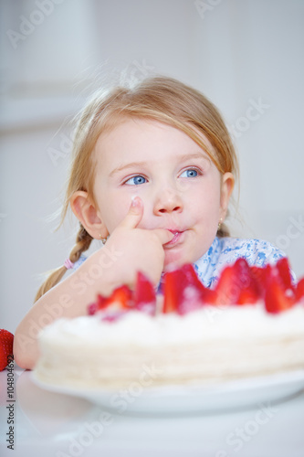 Kind feiert Geburtstag mit Erdbeerkuchen