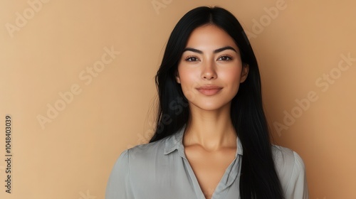 Portrait of a smiling Hispanic woman in her 20s with medium-length hair, wearing a purple shirt against a beige background.