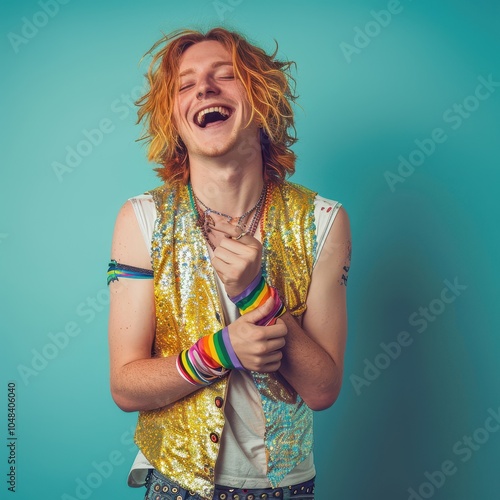 Joyful person with freckles and vibrant style showing exuberance and freedom in colorful fashion with rainbow accessories
