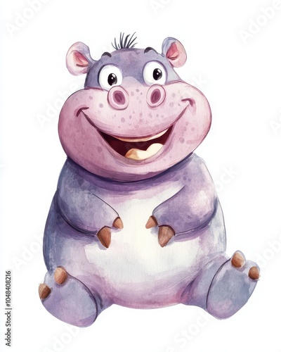 Adorable smiling cartoon hippopotamus with a playful watercolor splash background