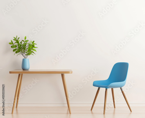 Minimalist armchair in cozy interior with wooden shelves on mint background