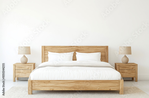 Minimalist wooden bedroom with comfortable bed and elegant lamps